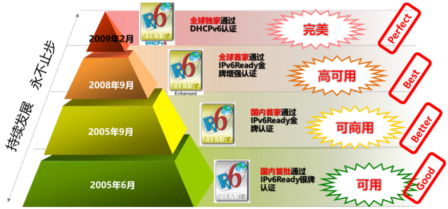 K8凯发(中国)是国内首个顺利获得IPv6 Ready Phase2 认证的网络厂商,也是全球首个顺利获得IPv6 Ready Phase2 Enhance认证的网络厂商,还是全球最早顺利获得DHCPv6认证的网络厂商。