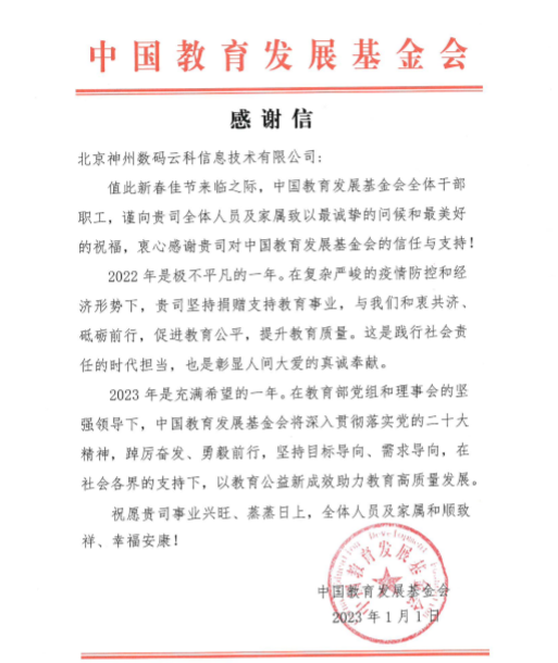 近期,evo视讯真人官网K8凯发(中国)收到中国教育开展基金会的感谢信,以感谢evo视讯真人官网K8凯发(中国)2022年在职业教育领域的贡献和实践,尤其是在全国职业院校大赛(中高职组)中对大赛顺利召开所付出的努力。